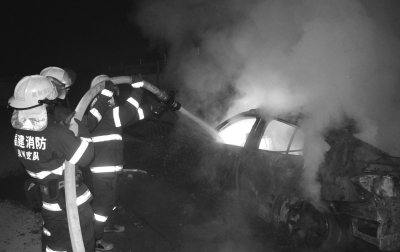 很快,水头消防中队工作人员赶到现场,当时事故车辆正剧烈燃烧,车头可见撞击的痕迹。看到车上人员都被安全救下,消防人员立即架起水枪进行扑救,经过15分钟努力,明火被彻底扑灭。