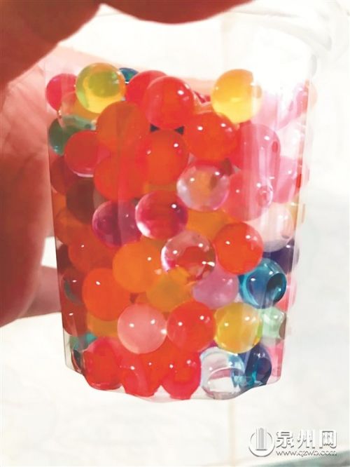 海绵宝宝的玩法是泡在水里,让它慢慢“长大”。记者在丰泽区第二实小对面的一家文具店买了一瓶海绵宝宝,外包装上未见任何产品相关信息,共有100多颗。昨日下午3点多,记者将这些海绵宝宝倒进塑料杯中,往里加了半杯水,海绵宝宝就开始一点点变大,一个小时后再看这些小球,已经比倒进去的水还要高。