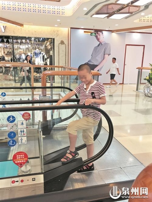 一名小孩在两个扶梯之间玩耍,差点被夹住。