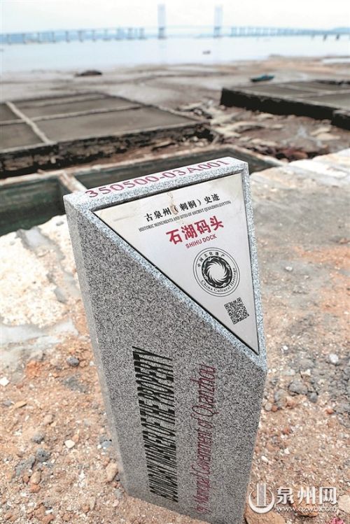 近日,泉州启动遗产点界桩安装工作。7月12日,在市申遗办的组织下,施工单位在石湖码头丁字坝东侧附近安装了一块刻有“古泉州(刺桐)史迹遗产区界桩泉州市人民政府立”字样的石碑,这块编号尾数为“A001”的石碑,是石湖码头遗产点遗产区(核心区)的第一块界桩,也是古泉州(刺桐)史迹16个遗产点中的第一块界桩。