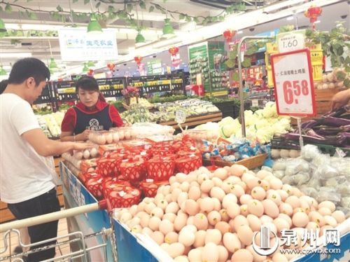 日前,在泉州中心市区泉秀街一家大型超市鸡蛋销售区,价格标签醒目地标注,土鸡蛋5.28元/500克、鲜鸡蛋5.68元/500克;在泉秀街另一家超市里,打出的价格为鸡蛋4.99元/500克,限购1000克;丰泽街一家超市的鸡蛋价格则卖出5.98元/500克的价格。