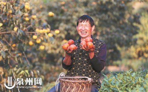 昨日,在安溪县蓬莱镇鹤前村,丰收的柿子让果农喜笑颜开。(张九强 摄)