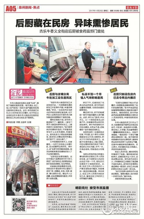 29日,本网报道了市区义全街的古乐牛香牛肉火锅店将后厨搬离店铺,设在乌岸头25号的民房内,利用洗衣机清洗牛肚,异味致周边居民深受其扰后,泉州市食品药品监督管理局的执法人员随即勒令其搬离居民区,并进行整改。昨日,早报跟随执法人员再次回访,目前“私奔”的后厨已迁回店铺,执法人员也对店内食材进行了抽检。
