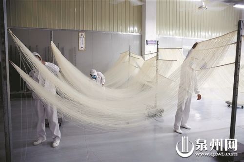 永春县蓬壶镇的一家“手工长寿线面”食品生产企业作为“雨露计划”培训实训基地,广纳周边贫困户为员工,或免费向贫困户传授有着四百多年历史的传统手工线面制作工艺,至今培训了500余人,带动乡亲增收致富。(陈晓东 摄)