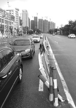 “倒伏”的交通指示标志杆位于马路中央,记者看到,交通指示标志杆“伤痕累累”,与地面呈30度夹角;相邻的几块中间隔离护栏也倾斜到一边。