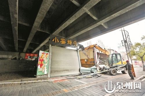 执法人员拆除市区高速桥下的违建