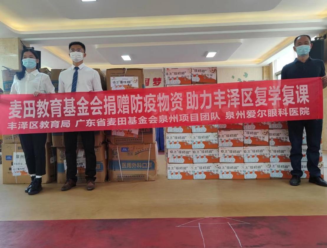 4月23日,丰泽区教育局携手麦田基金会泉州项目团队、丰泽区儿童青少年近视防控科普基地——泉州爱尔眼科医院为北峰片区学校捐赠了36000只一次性医用口罩以及400瓶84消毒液,助力学校开学复课的防疫工作。泉州爱尔眼科医院作为青年文明号单位以实际行动助力学校疫情防控工作,除了捐赠,在疫情期间爱尔青年们也是纷纷投入一线,用行动和奉献诠释青春力量与担当,这是企业的社会责任与担当。”