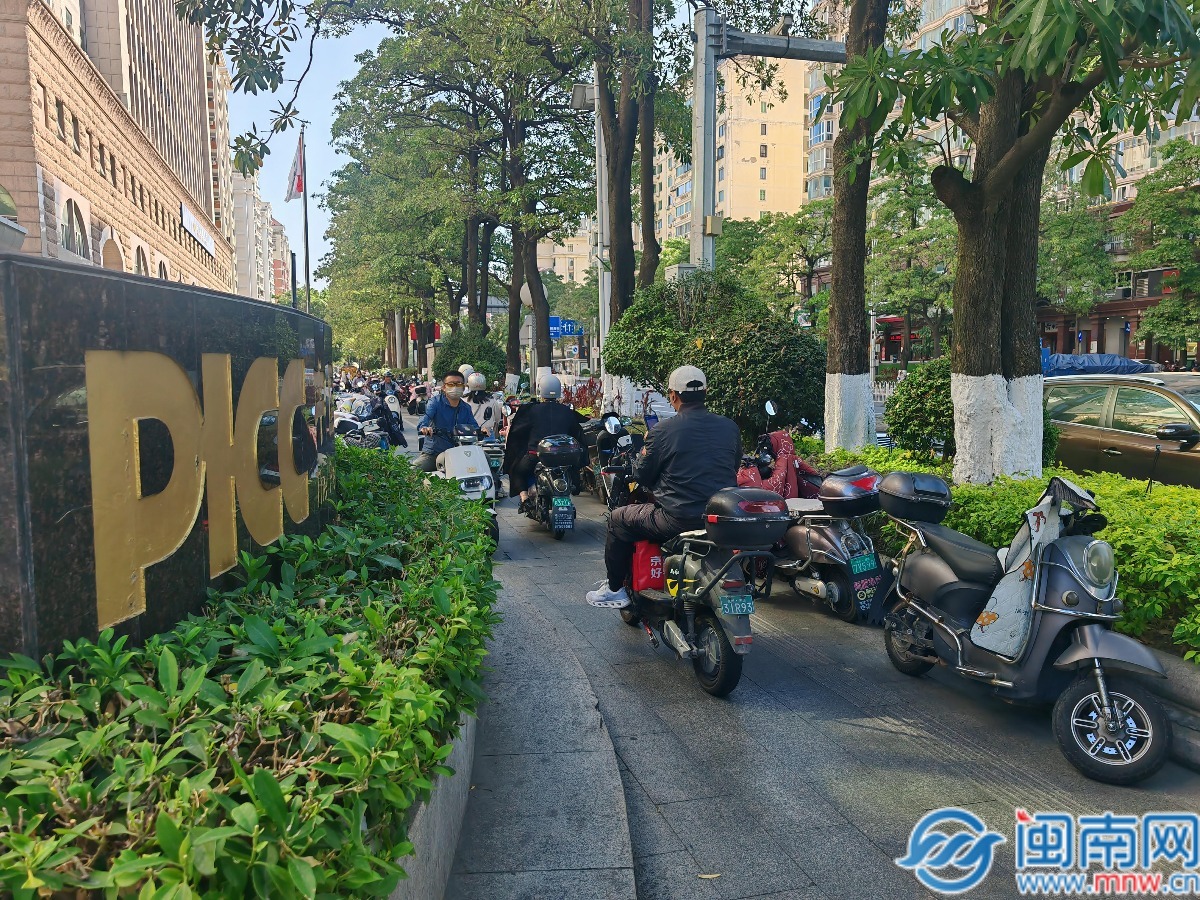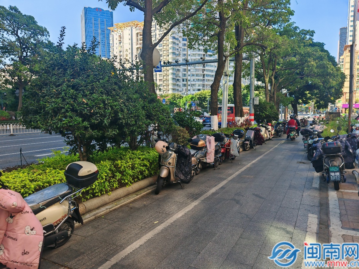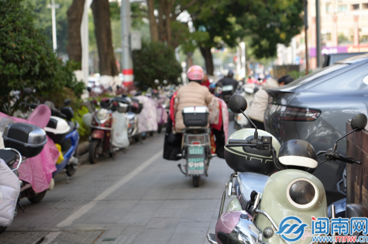 12月2日上午,闽南网记者在现场看到,在网友所指的违停非机动车道上,两侧停靠着数十辆电动车,前后延伸数十米,挤占原本就不宽的通行空间。