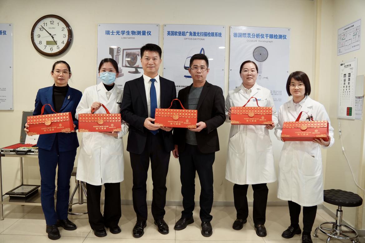 在惠光爱尔眼科医院CEO杨育义、经营院长何建东、工会主席林亮亮的陪同下,惠安县总工会副主席杨雪卿将满载心意与工会温情的春联礼盒送至惠光爱尔眼科医院一线职工身边。