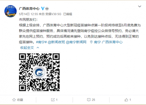 5月14日,网传“免预约打疫苗”,广西体育中心大排长龙。据现场相关负责人了解到,网传的“13日到16日免预约打疫苗”的消息不实。目前疫苗供应充足,大家还是要先预约再接种,避免长时间排队等候。14日中午,广西体育中心官方微博发出提醒:务必请大家先在网上预约,预约成功后再前来接种。