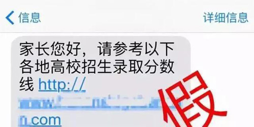 骗子模仿“校讯通”“高考直通车”等向考生及家长发送带有链接的“服务短信”,一旦点击链接进入,手机可能被植入木马病毒,进而窃取绑定的银行卡账户、密码等资料,转走钱财。