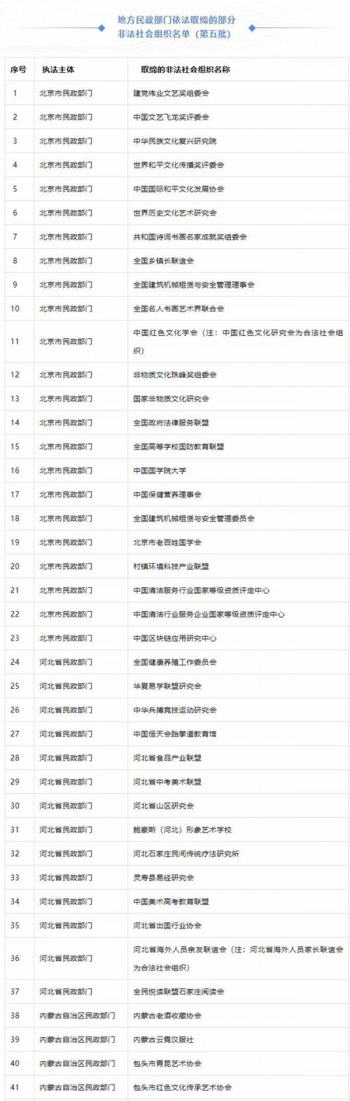 为持续加大舆论宣传力度,提高公众防范意识,发挥社会监督作用,现向社会公布第五批地方民政部门近年来依法取缔的部分非法社会组织名单。社会公众如果发现名单中的非法社会组织仍在开展活动的,可依法向公安机关报案。同时,提醒有关机构和社会公众,在与社会组织开展合作或参与其活动时,请通过“中国社会组织政务服务平台”(www.chinanpo.gov.cn)、“中国社会组织动态”政务微信(微信号:chinanpogov)核实其身份,避免上当受骗;也欢迎社会各界通过“中国社会组织政务服务平台”提供涉嫌非法社会组织活动线索。