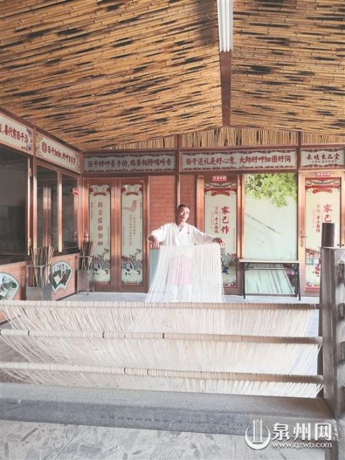 面线师傅正在忙碌地晾晒闽南特色食品手工面线