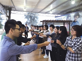 当天,来自灵秀镇企业50余名单身职工走进婷婷福利院,通过慰问、做志愿服务等形式携手献爱心。随后在正源果蔬合作社里,在主持人妙语连珠串联下,单身职工们开始消除陌生感,而自助烧烤、同心球、针线情、纸杯传情、温情递圈等趣味游戏更是把活动的气氛推向了高潮,单身职工们玩得不亦乐乎。