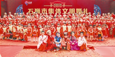 10月27日上午,一场充满闽南婚俗韵味的中式婚礼——“缘聚狮城·恩爱永恒”2016年第三届石狮市集体文明婚礼热闹举行,参加集体婚礼的46对新人来自陕西、吉林、安徽、重庆、江西和福建等地,他们都在石狮生活着、奋斗着,彼此相遇相恋,终成眷属。当天身穿凤冠霞帔、状元袍的新人们在石狮市领导的证婚下喜结连理,完成三拜堂、掀盖头等仪式……整场婚礼既别开生面,又简约浪漫,给他们留下了美好而难忘的记忆。