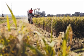 石狮蚶江镇水稻新品种中试基地 农民水稻收割忙