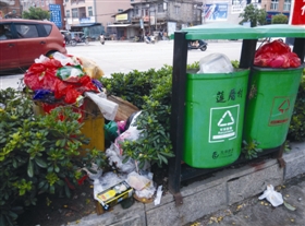 昨日,记者从市城市管理综合考评中心获悉,在石祥路莲厝村段道路两侧绿化带内的杂乱现象令人瞠目结舌:在长约400米距离的临村道路两侧,竟有60余处积存垃圾,其中大量堆积的生活垃圾就有40余处。放眼看去,路边数十个果皮箱、垃圾桶几乎全部是满满的垃圾,甚至在多个垃圾桶旁还另外堆积着满满垃圾的竹筐,而且与临路边的数家食杂店、牛肉店和小餐馆相距仅数米远,不仅卫生状况极差,也使原本整齐美观的绿化带变得杂乱不堪。
