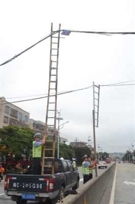 昨日上午8时20分,交警支队泉港大队涂岭中队接110指令:“324国道涂岭段有电缆坠落,造成双向路段交通堵塞,请迅速处置!”正在附近巡逻的中队负责人张国伟、陈美荣接到警情后第一时间赶到现场,发现两根电缆线因被车辆撞拉挂于离地面一米左右的半空中,经过此处的车辆纷纷停下不敢通行,双向路段交通堵塞各一公里多。