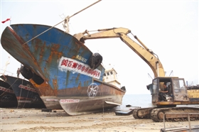 8月26日上午,祥芝镇福祥恒辉船舶修造公司里轰隆声不断,今年来查获的12艘外地逃窜至我市的非法采捕红珊瑚船舶被机器逐一拆解。这是我市今年严厉打击非法采捕红珊瑚暨涉渔“三无”船舶专项行动以来,首次举办集中拆解现场会。省海洋与渔业厅总工程师李涛、省海洋与渔业执法总队长叶建平、泉州市政府副市长林万明、泉州市海洋与渔业局局长陈文堃、石狮市政府副市长庄宝玲参加拆解现场会。