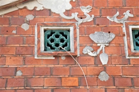 “看!上面还有弹痕。”顺着两位老人的指引,记者望去,这间大厝外墙上还有多处弹痕依稀可见,外墙红砖表面有的被半块削去、有的留下弹孔洞。两位老人相互确认后告诉记者,后门外约五六米处,原来有一处炸弹爆炸留下的深坑,现已填成一块平地。
