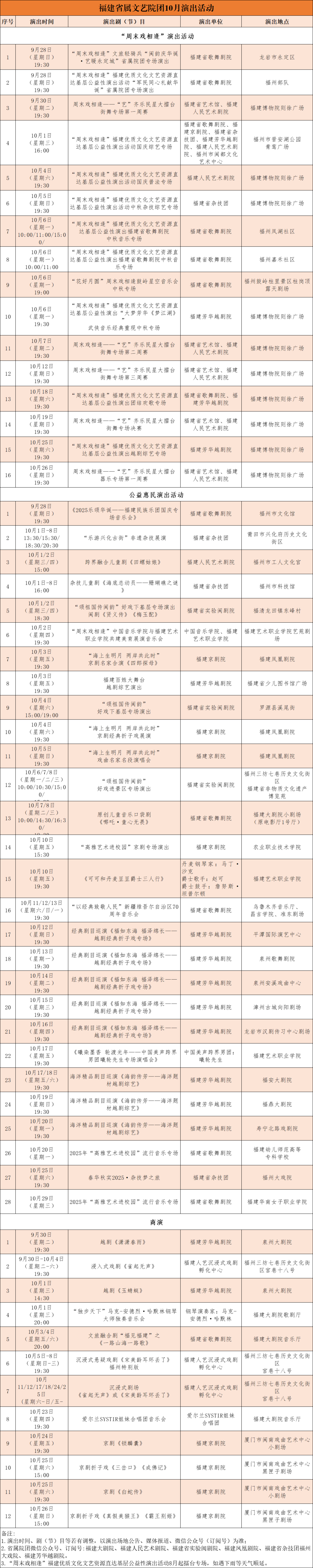 演出单位:福建省歌舞剧院、福建人民艺术剧院、福建京剧院、福建省杂技团、福建芳华越剧院、福州市闽都文化艺术中心