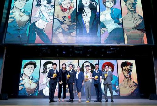 超级网剧《蛋黄人》主演林柏宏、虞朗、于翔、陈碧舸、范立美、高至霆与人物设定图合影