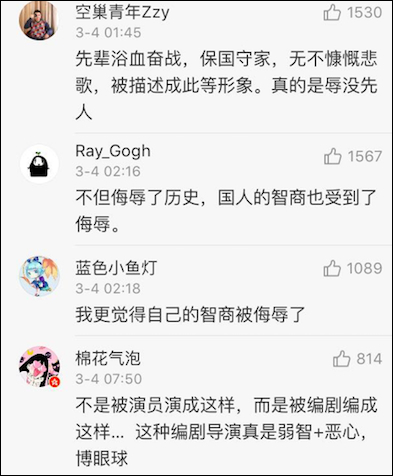 网友们感觉智商受到了暴击:先辈的浴血奋战,被演成了这样的喜剧,不仅侮辱了历史,更侮辱了我们的智商。