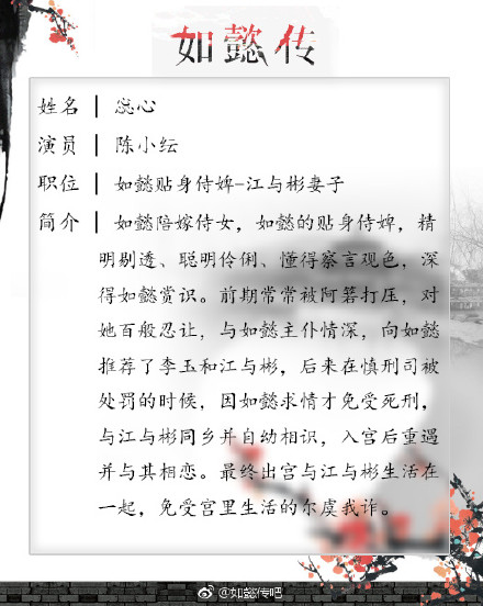 惢心,陈小纭饰演,电视剧《如懿传》角色之一。如懿陪嫁侍女,与如懿主仆情深,向如懿推荐了李玉和江与彬,后来在慎刑司被处罚的时候,因如懿求情才免受死刑,最终出宫与江与彬生活在一起,免受宫里生活的尔虞我诈。