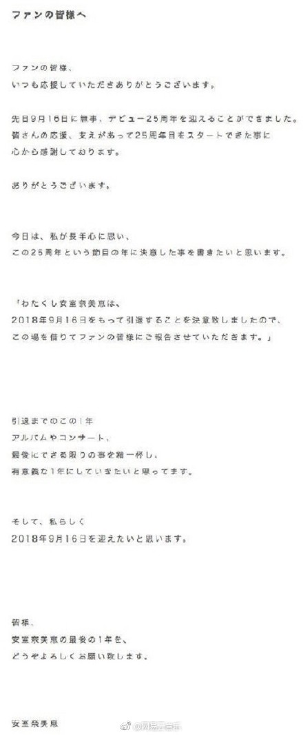 “我,安室奈美惠,决定在2018年9月16日引退,借由这个地方向所有粉丝报告这个消息。”