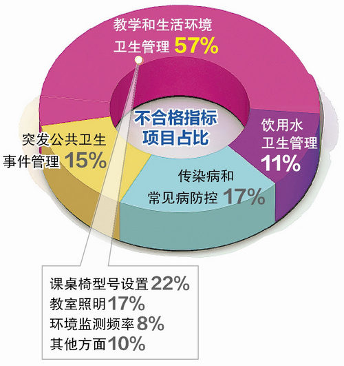 在此次评价的65项指标中(公共浴室5个指标未参评),评价出现不合格的有31项。四个板块的不合格项目累计数占不合格总项目数的比率,从高到低分别为:教学和生活环境卫生管理57%、传染病和常见病防控17%、突发公共卫生事件管理占15%、饮用水卫生管理11%。