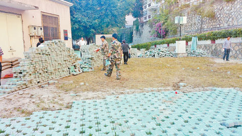 整治中,城管工作人员清理植草砖。