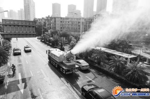 雾炮车上路工作。