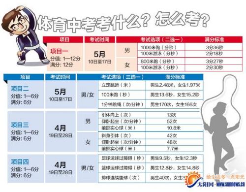 吴亿年介绍,今年中考体育有四大考试项目,每个大项目至少有两个选项供选择(详见图表)。