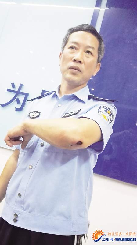 有诈赌团伙在菜市场作案,居民向灌口派出所民警梁天柱举报该情况,他只身一人赶到现场暗访取证,被发现后遭遇袭击,老梁以一敌十,在双膝和肘部受伤的情况下,依然将一名嫌疑人抓住。