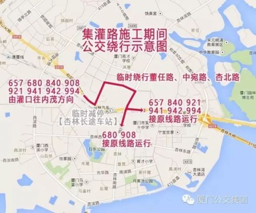 1、线路走向:海滨大厦、会展中心、梧村公交场站始发,行至集杏海堤或杏林大桥,改经杏滨路、杏东路、杏北路、杏前路接原线路运行;返程由灌南工业区、小西门始发,行至杏前路董任路路口,改经董任路、中宛路、杏北路、杏前路接原线路运行。2、站点调整:往灌南工业区、同安小西门单向减停化工学校、轻工学校、内林、内茂;657路往梧村单向减停杏林长途车站。