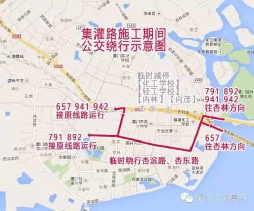 1、线路走向:软件园三期始发,行至杏林湾路杏锦路口,改经杏北路接原线路运行;返程保持不变。2、站点调整:往市行政服务中心单向减停中航城站、园博三里站、园博一里站、园博苑西门站、化工学校站、轻工学校站、内林站、内茂站,增停杏北内茂站。