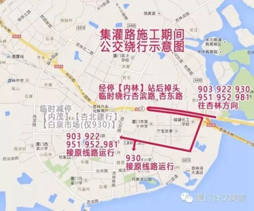(二)2016年5月7日0时至2016年8月30日24时,集灌路(董任路口至内茂路口)段进岛方向封闭围挡施工,禁止一切车辆通行, 进岛车辆绕行董任路—杏林北二路、中宛路、九天湖路—杏锦路—杏林大桥等外围道路。