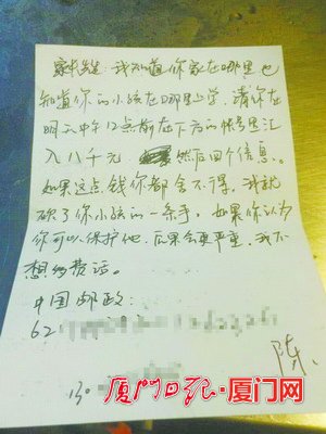 收到勒索纸条后,在厦门日报小记者一位家长的建议下,陈女士马上向警方报警,也并没有按照纸条上的要求,把钱汇入指定账户。几乎与此同步,本报微信公众平台接到家长的报料,记者立即向警方反映情况,并密切关注事件进展。