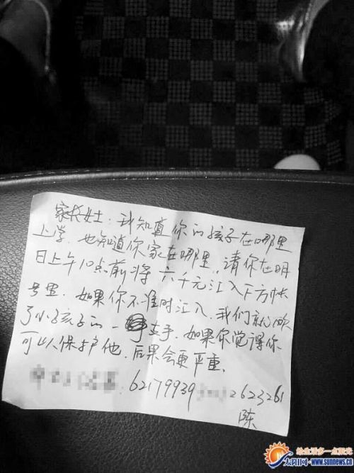记者看到,纸条上的内容具体如下:“家长女士,我知道你的孩子在哪里上学,也知道你家在哪里,请你在明天上午10点前,将六千元汇入下方账号里,如果你不准时汇入,我们就砍了小孩子的一只手。如果你觉得你可以保护他,后果会更严重。”下方还附上了账号和联系电话。记者拨打该电话,发现该号码的归属地为漳州。