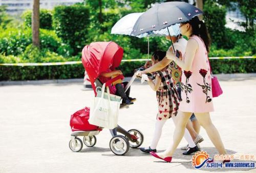 昨日迎来高温,市民出行都全副武装。记者陈理杰摄