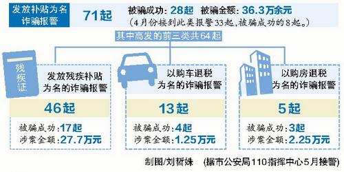 昨日记者从市反诈骗中心了解到,5月份以发放各类补贴为名的骗术多发,除了残疾补贴,还有购车退税补贴和购房退税补贴。此外,以教育补贴、生育补贴为名的诈骗零星发案,市民被骗金额都不大。