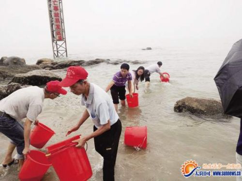 昨日10时许,来自厦门市海洋与渔业系统工作人员及社会志愿者来到厦门环岛路“一国两制”段海域,与他们一同来到该处的还有数万尾鱼苗。