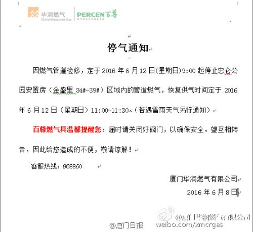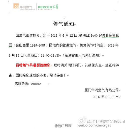 6月12日厦门后埔、金鹭花园等区域计划停气