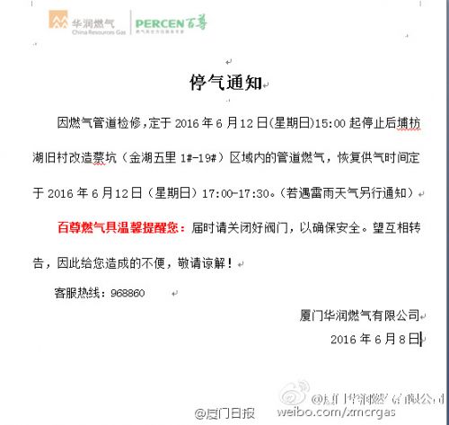厦门网讯 从厦门华润燃气有限公司获悉,6月12日厦门后埔、金鹭花园等区域计划停气。请关闭好阀门,确保安全。