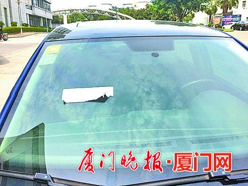 厦门网-厦门晚报讯(文/图 记者 张婧玮 实习生 谢翔莹)到厦门创业园找朋友谈事,不到一个小时出来取车,发现挡风玻璃被贴了一张“禁止停车”的纸条。纸条很不好清理,让车主黄先生很气愤,认为“摆明了就是欺负车主。而且物业没有执法权,没有权限这么做”。物业则表示,为维护交通秩序,一直以来都是这么操作,贴纸条只是起警示作用。