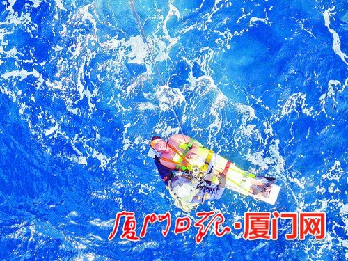 救援队员将昏迷渔民拉上直升机。