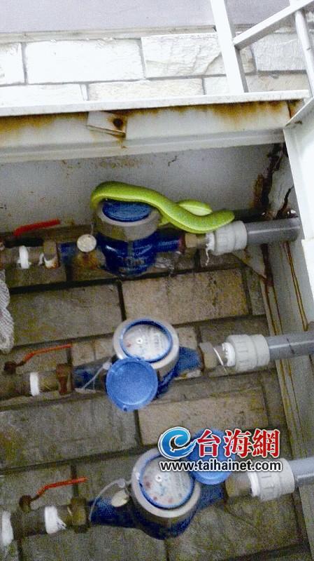 当时,该小区抄表员林女士正在抄水表,当她打开小区94梯的水表箱时,竟看到一条绿色的蛇盘在一个水表上,它的眼睛红通通的,朝着她吐着信子!林女士吓一跳,赶紧叫物业保安来处理。