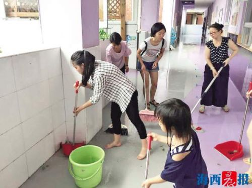 连日来,不少学生家长也自告奋勇来到学校,帮忙清理打扫校园。16日,上百名家长志愿者来到海沧区第二实验小学开展重建工作。在海沧天心岛小学的家长志愿者中,还有几位身怀六甲的妈妈也来帮忙。