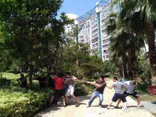 一二三,一二三,随着口号声的呐喊助威,小区居民合力把倒伏的树拉起。