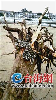 这种蛇平时生活在山林里,如今出现在这里,应是受台风影响。此外,据猜测,这木头有可能是漳州那边漂来的,要真是这样,它的“冒险经历”有令人难以想象的波折。